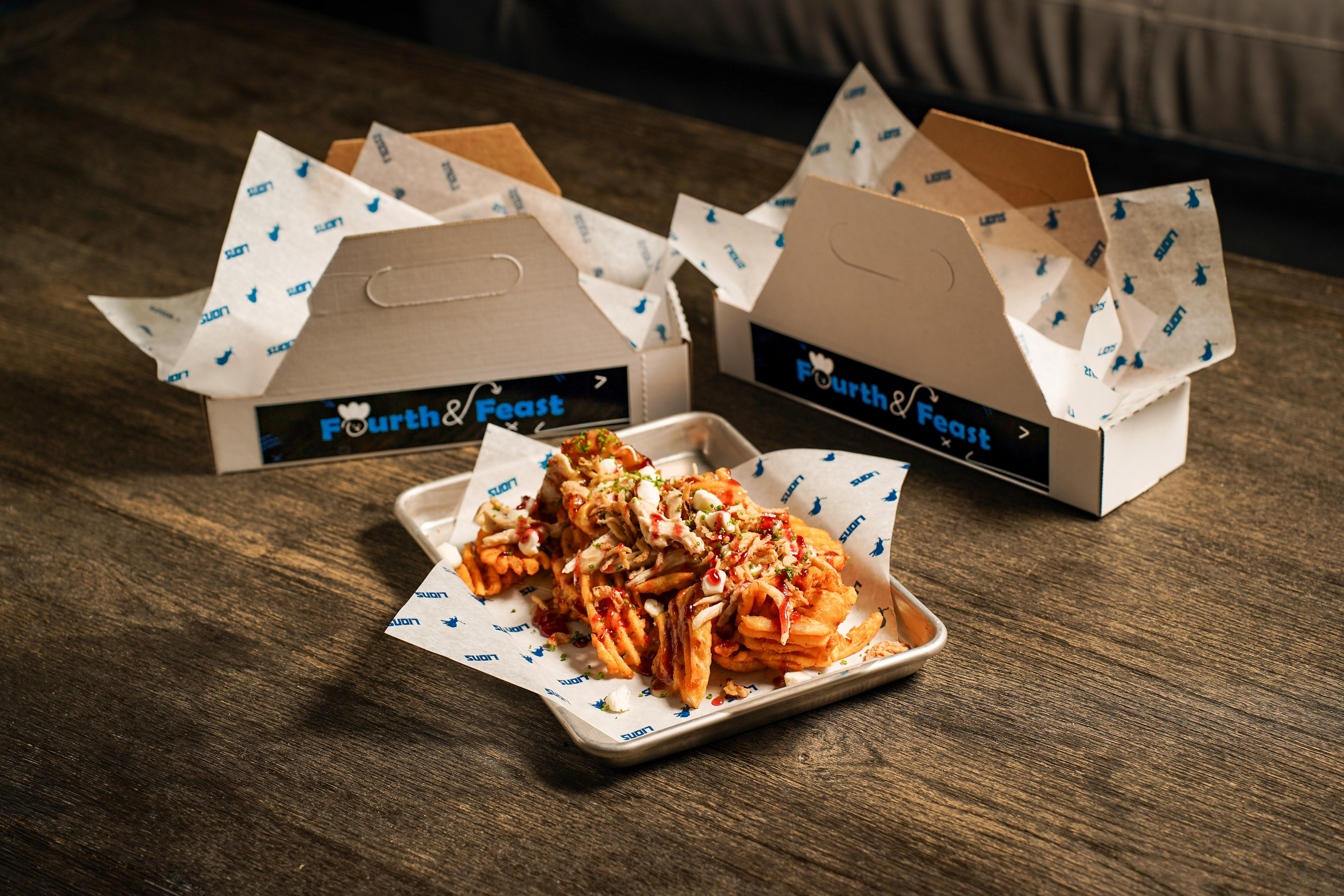 Thanksgiving-inspired sharable-crispy waffle fry loaded with roasted turkey, cheese curds, gravy, cranberry drizzle and topped with crispy onions
