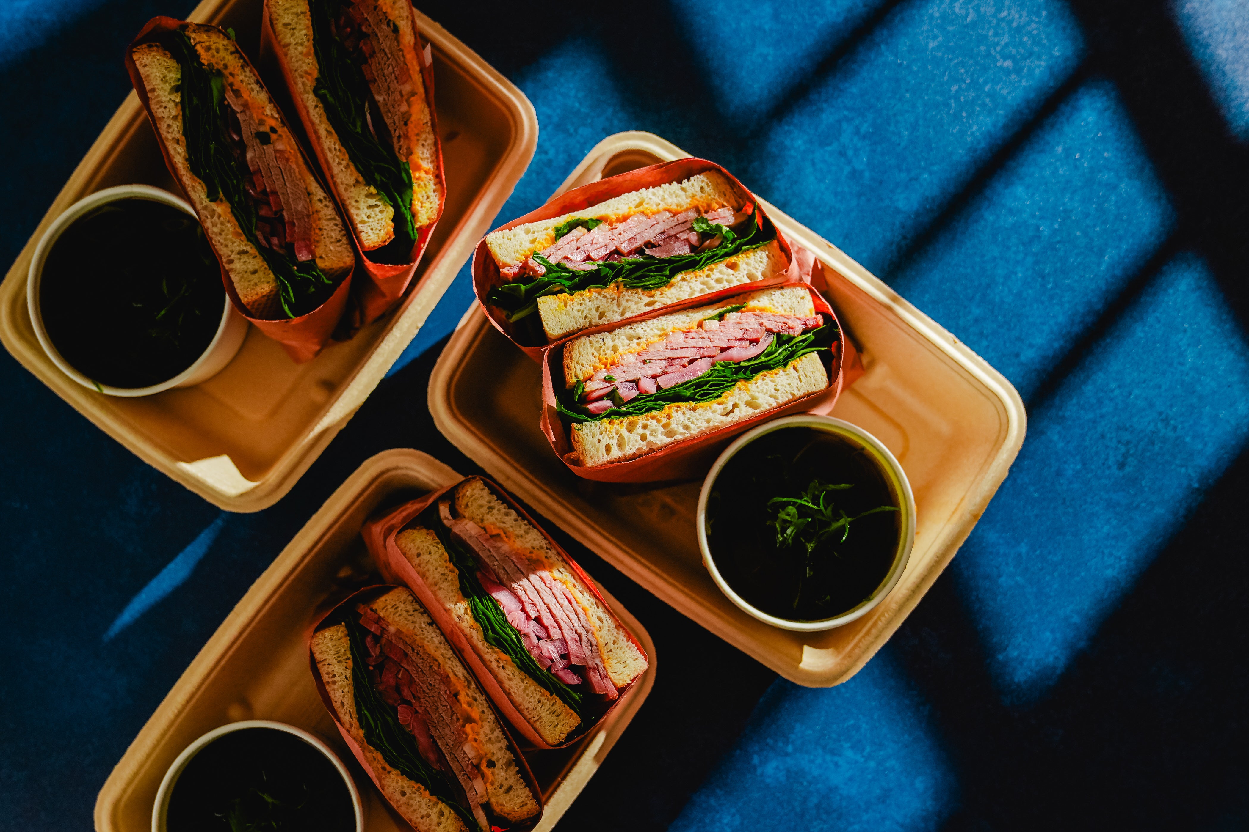 Whole brisket seasoned with kosher salt, granulated garlic and coarse ground pepper, coated in pho broth. Served on thick rye bread and topped with garlic mustard aioli and pickled red onions.
