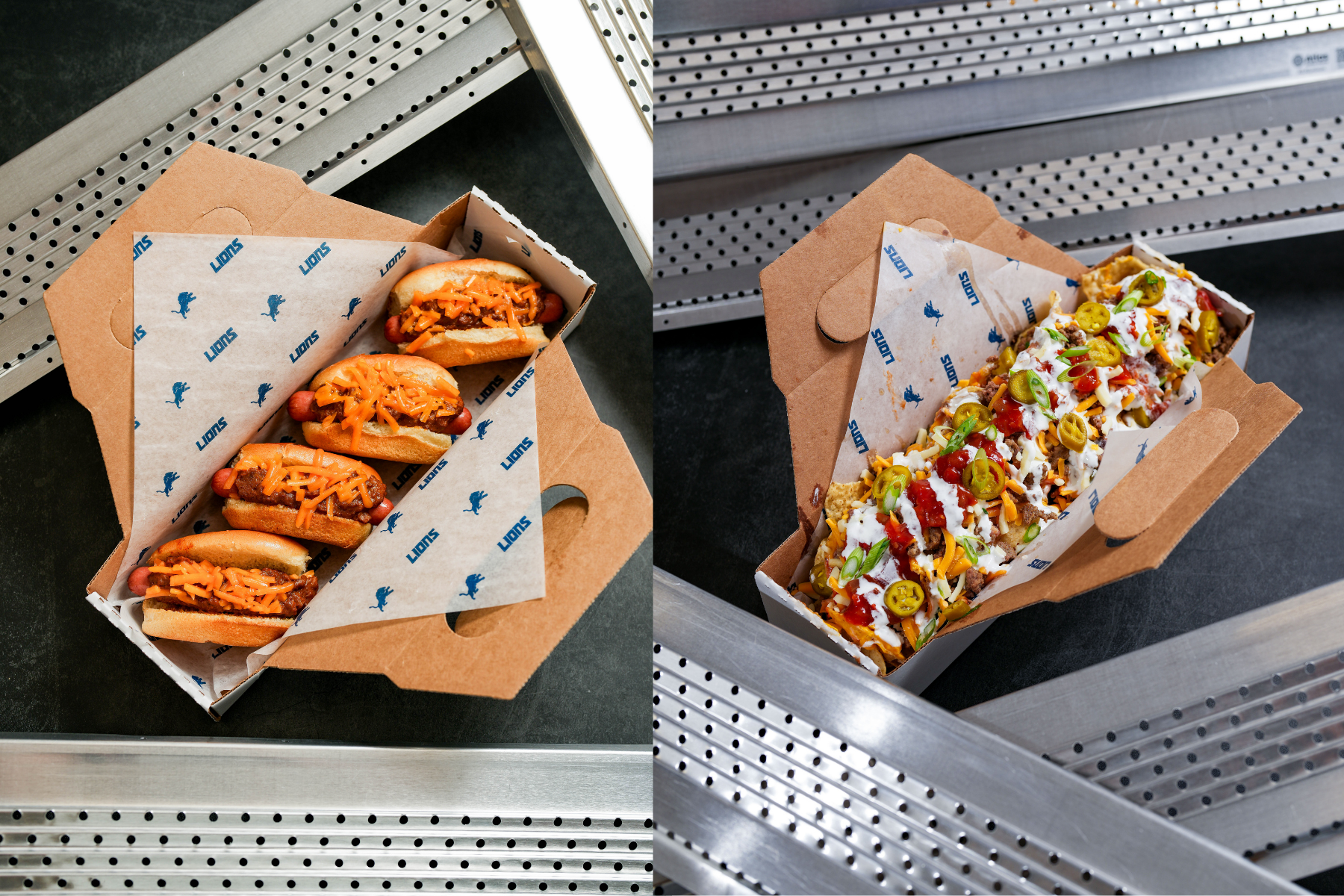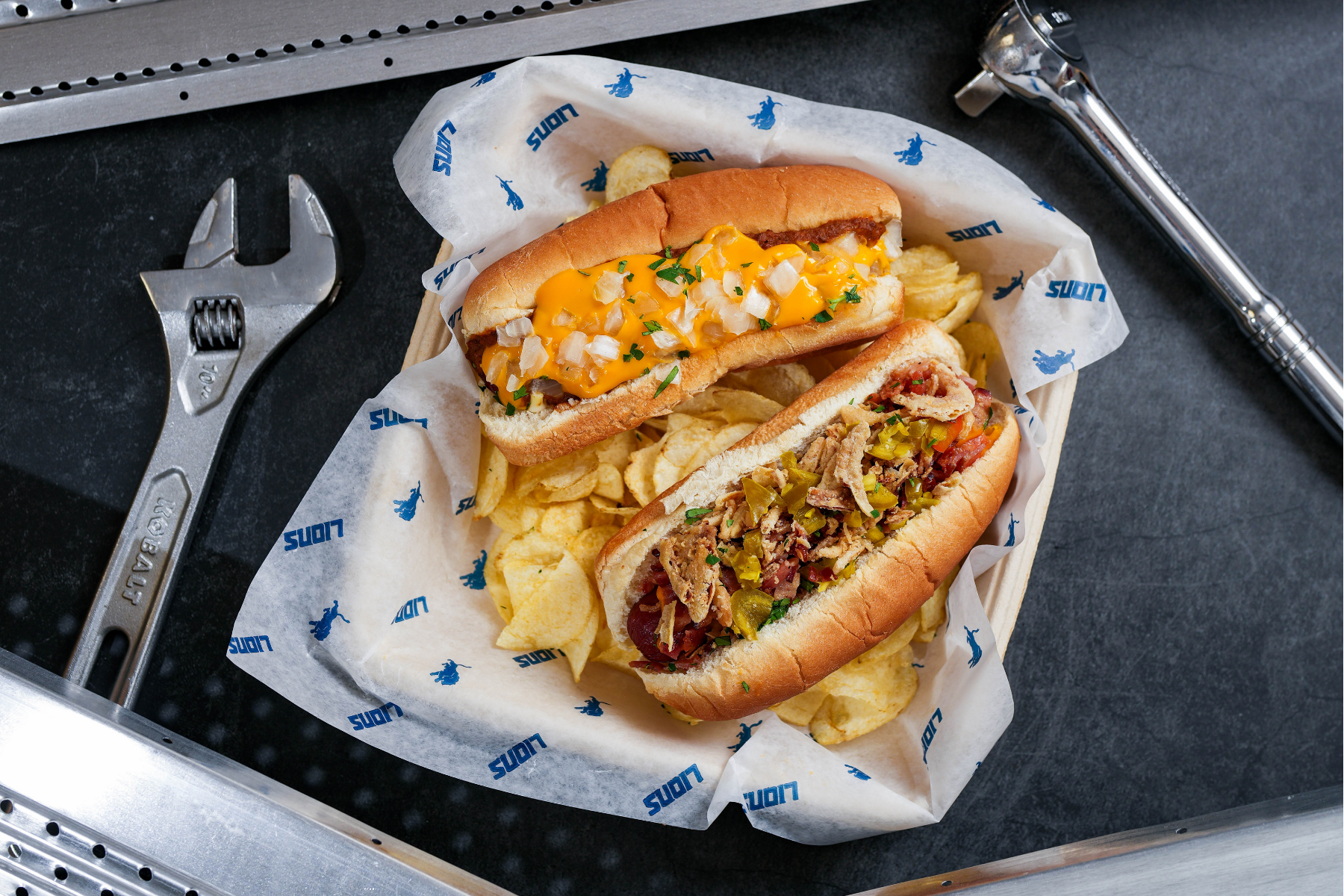 Super Dog Duo - Chili Cheese Dog with Onion & Spicy Bacon Jalapeño Dog with Cripsy Onions