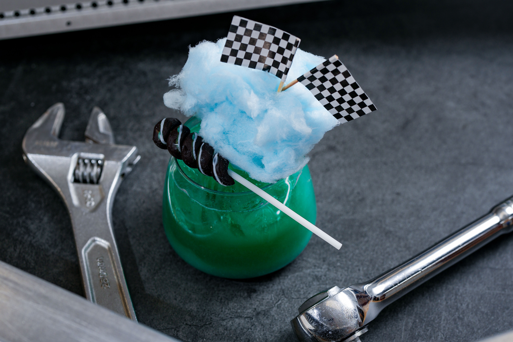 Little Moto Cruiser - Blue Cotton Candy Bomb, Pineapple Juice, Sprite, Flag Pick, Sucker, Cotton Candy
